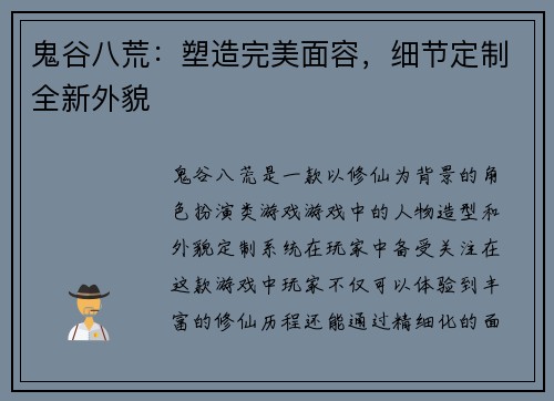 鬼谷八荒:塑造完美面容,细节定制全新外貌